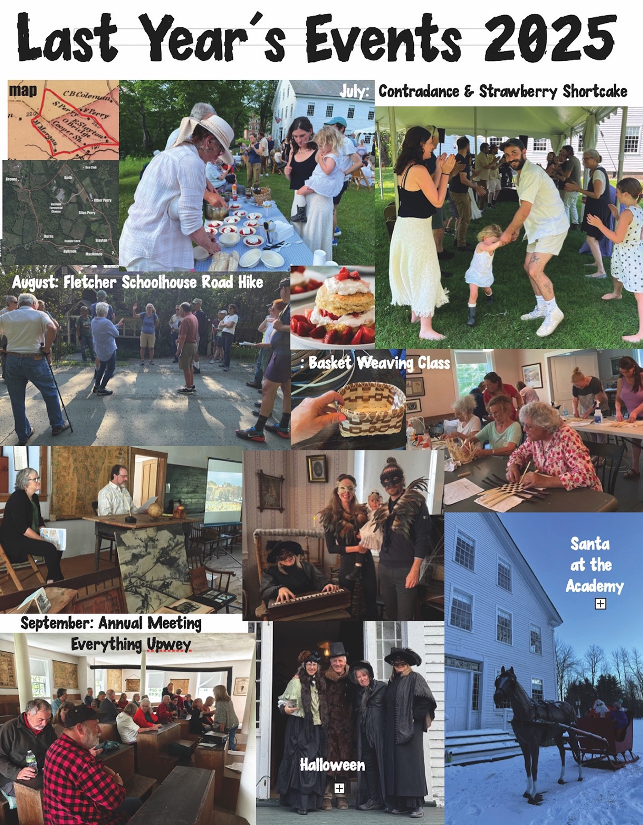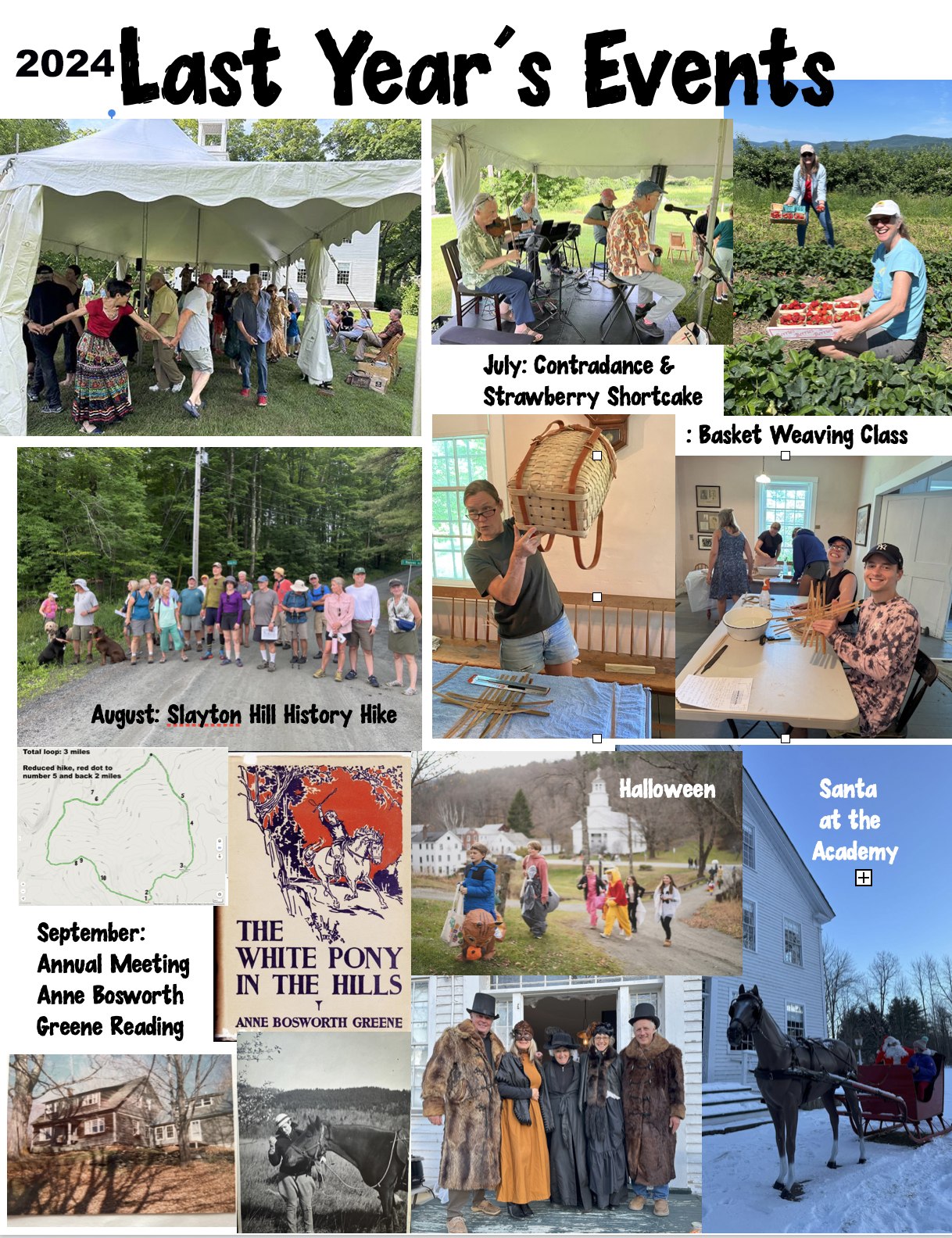 SATURDAY JULY 3, 2:30 PM: OPENING DAY AND HISTORY HIKE. Meet at the Academy for a guided hike on Fletcher Hill to the Stratten Place Cellar Hole Complex and on to the Lover's Lament Stones. It's 2 miles over uneven terrain, so plan about 2 hours and wear sturdy shoes!